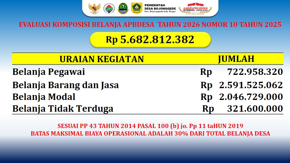 KOMPOSISI BELANJA APBDESA TAHUN 2026 NOMOR 10 TAHUN 2025 SESUAI PP 43 TAHUN 2014 PASAL 100 (b) jo. Pp 11 taHUN 2019 BATAS MAKSIMAL BIAYA OPERASIONAL ADALAH 30% DARI TOTAL BELANJA DESA